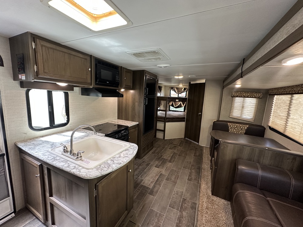 Come see just how fun and easy camping can be with this Bullet 277BHS travel trailer! You will find plenty of space inside thanks to the single slide out along the roadside. The front bedroom features a walk-around queen bed plus there are sliding doors on either side of the entertainment center. In the rear more sleeping space can be found at the double over double bed plus there is a ladder for easy access to the top bunk. The chef in the family can now enjoy more time outside while prepping meals at the outdoor kitchen and more!