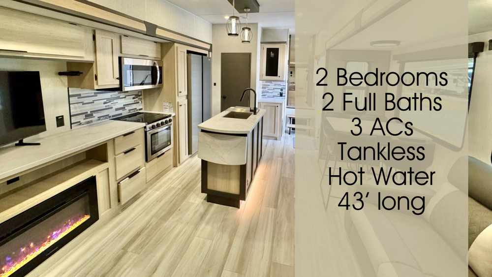 Master bedroom: NEW RV king sized bed with under bed storage, over bed storage, 2 closets with added 4 clothes hanging rod, dresser with 12 built in drawers.