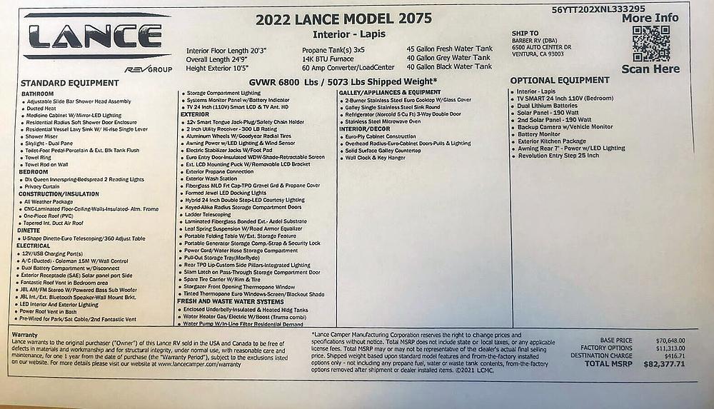 Bought new in April 2023. VERY LIGHTLY USED. SLEEPS 4. Dinette makes easily into a Queen Size Bed! This highly popular floor plan is hard to find in as new condition. It is the perfect couples RV. An awesome floor plan and this one is fully loaded with factory options. REAR OUTSIDE KITCHEN WITH 2 BURNER COOKTOP + SINK + REAR AWNING, LITHIUM BATTERIES, 2 SOLAR PANELS +++ see the MSRP sticker in the photos. We are retired and have used this RV very little. Never smoked in and no pets have been in the RV. It is like new. We live in Arizona but the RV is stored in Ventura County California. Priced to sell now, make it yours!