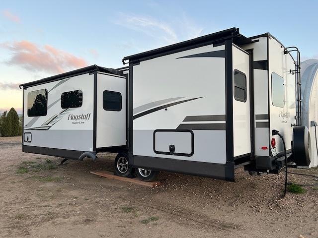 Outside, the Flagstaff Super Lite boasts a sleek exterior with a durable construction that is built to withstand the rigors of the road. The aerodynamic design reduces wind resistance, making for a smooth and efficient towing experience. The trailer is also equipped with a power awning, outdoor barbecue and ample storage space for all of your gear and supplies.