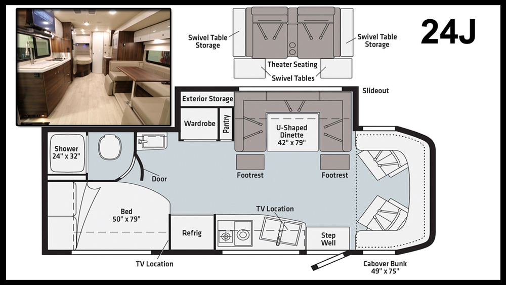 The Winnebago View and Winnebago Navion are available in 3 floorplans. The View and Navion 24J floorplan features a deeper slideout from the previous 20 inches deep to the increased 30 inches. In the slideout youll find the large U-Shaped Lounge Dinette that provides the perfect dining solution, workstation, game table or the optional theater seating with flip-up ottomans and swivel tables. The 24J also features a rear corner bed and the sink and vanity outside of the shower and toilet area. This allows someone to be in the bathroom while another uses the sink or mirror providing each privacy.