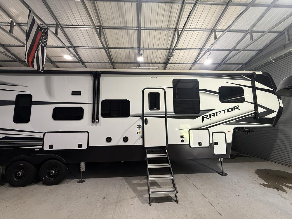 Luxury meets adventure in this 40-ft fifth-wheel toy hauler! The Raptor 362 offers a spacious layout with a private king bedroom, full kitchen, and a large rear garage with ramp/patio system. Sleeps up to 6 comfortably.