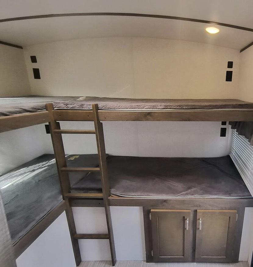 The 3100QB layout includes a master bedroom with a queen-sized bed, as well as a separate bunkhouse area with quad bunks, making it ideal for families with children. The open living area features a sofa and dinette that can easily convert into additional sleeping spaces when needed. The kitchen is well-equipped with modern appliances, a pantry, and ample storage space for all your cooking essentials.