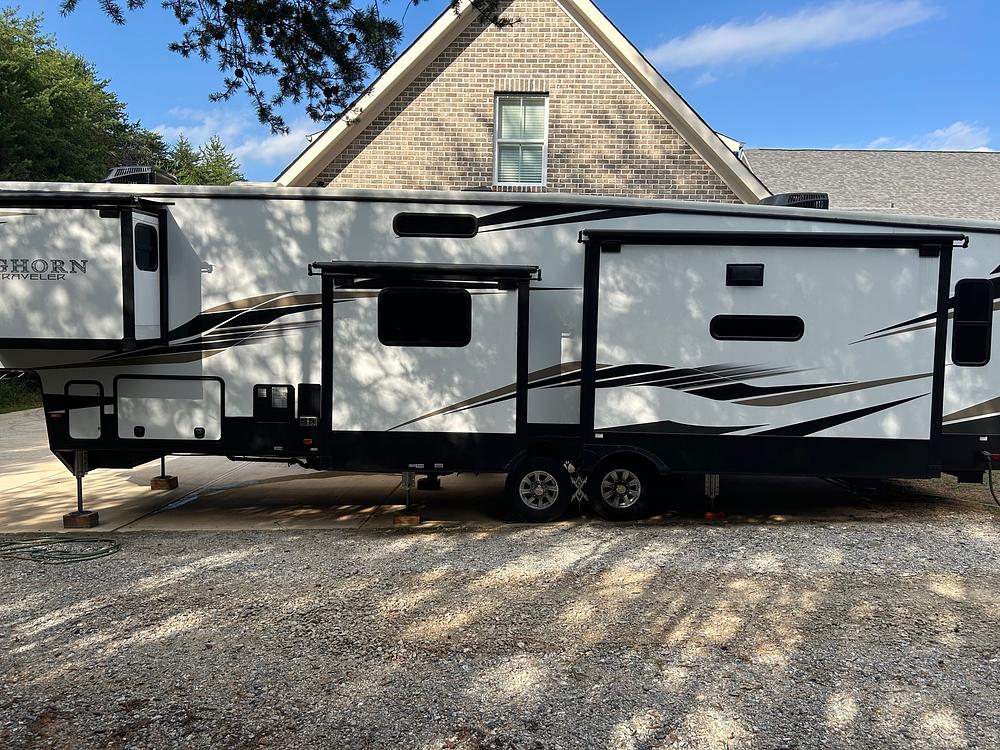 The 2022 Heartland Bighorn Traveler 39MB, parked on-site and used as temporary housing during a home build, has had very light use.