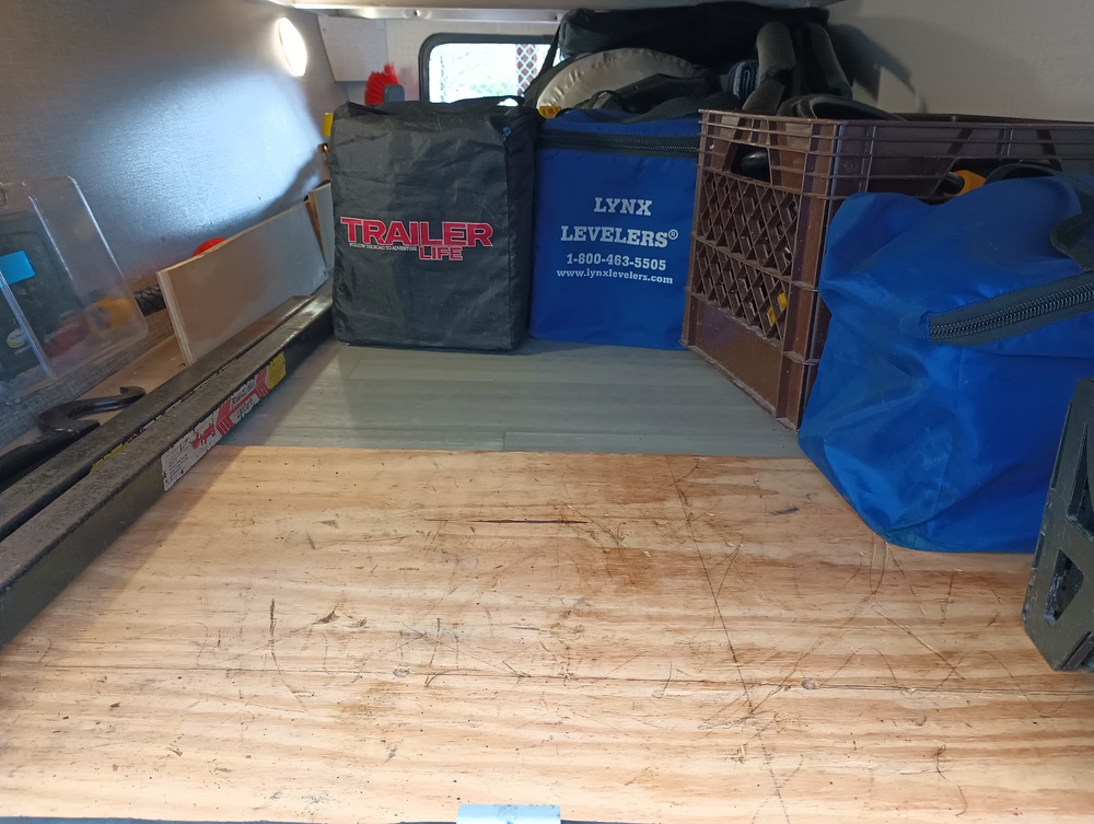 Replace chip board cover on under seat storage with plywood hinged with nitrogen cylinder