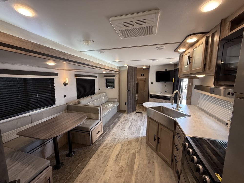 2 COLD A/C UNITS. TANKLESS WATER HEATER, 50AMP POWER. OUTDOOR STORAGE. OUTDOOR KITCHEN, SOLID STEP ENTRY. DUAL AWNINGS WITH LED LIGHTS. LUXURY FEEL THROUGHOUT!! WASHER/DRYER PREP.