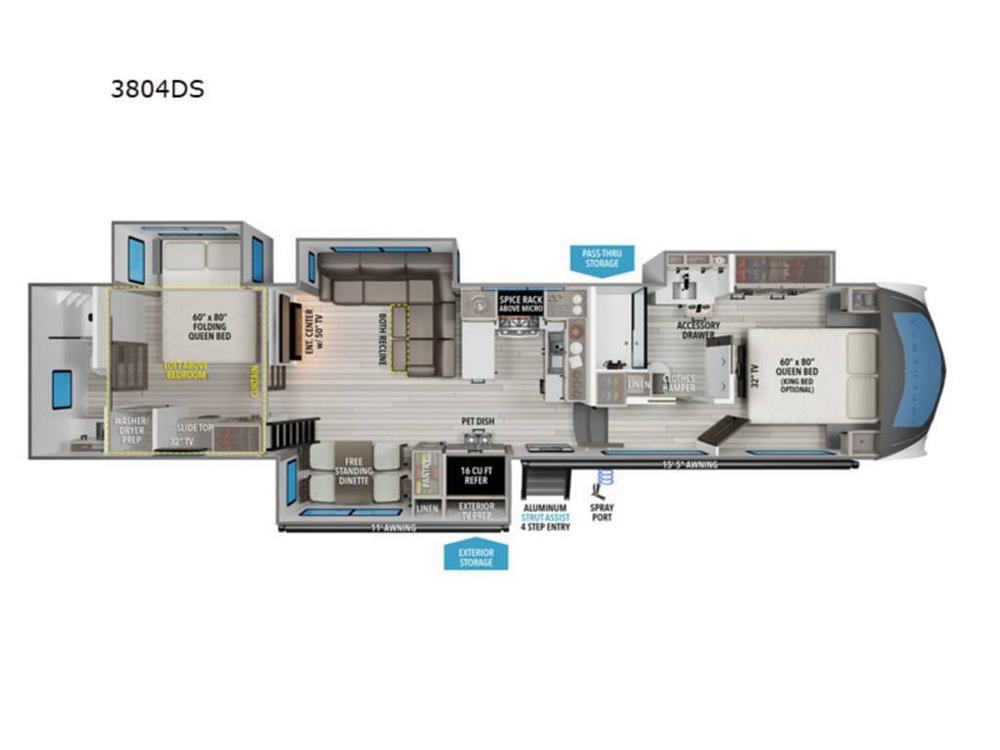 Grab the whole gang and head out in this fifth wheel featuring two private bedrooms, two full baths, and quad slides for even more space in this widebody layout. The living area featuring dual opposing slides offers space to dine and relax including an L-shaped sofa with recliners opposite the entertainment center and fireplace. This fireplace can be used to heat the living area or just for ambiance! You'll also love the full kitchen with ample counter space, a spice rack above the microwave, a pull-out pet dish, soft closing cabinets and more convenient features. The front master bedroom includes a king bed with an optional queen bed, a private entrance into the dual entry bath with a clothes hamper cabinet built in, plus a slide out with the wardrobe and bath sink. Under this king size bed can fully be used for storage. And your guests can take the second master bedroom with a folding queen bed slide with ample storage space underneath, washer and dryer prep, a full rear bath with a very tall shower, and even a loft above for more sleeping space with extra cabinets and shelves. Use this for the kids or just as storage.