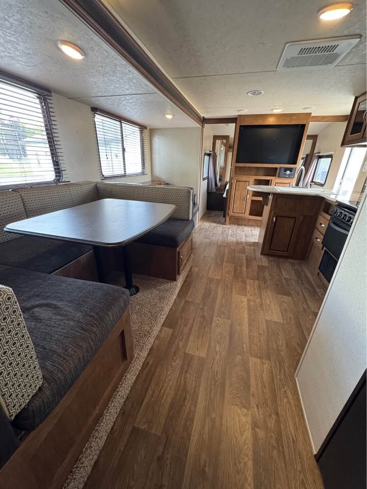 The 2017 Forest River Cruise Lite 282QBXL is a spacious and well-equipped travel trailer that is perfect for families or large groups looking to hit the road in style and comfort. This model offers ample sleeping space with a queen bed in the front bedroom, bunk beds in the rear, and a convertible dinette and sofa for additional sleeping areas. The kitchen is fully equipped with a refrigerator, stove, microwave, and plenty of storage space for all your cooking essentials.