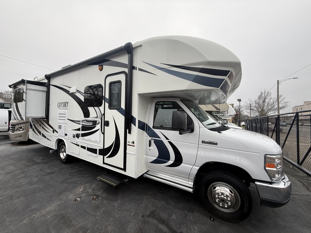 Step into the world of luxury and comfort with the **2020 Entegra Coach Odyssey 26D**. This exceptional motorhome combines sleek design, modern amenities, and superior craftsmanship to elevate your travel experiences. Constructed on a Ford E-450 chassis, the Odyssey is robust, reliable, and ready for any adventure. The captivating exterior finish, coupled with streamlined body lines and chic decals, ensures that you'll make a statement at every campground. It's more than just an RV; it's a gateway to incredible journeys waiting to unfold.
