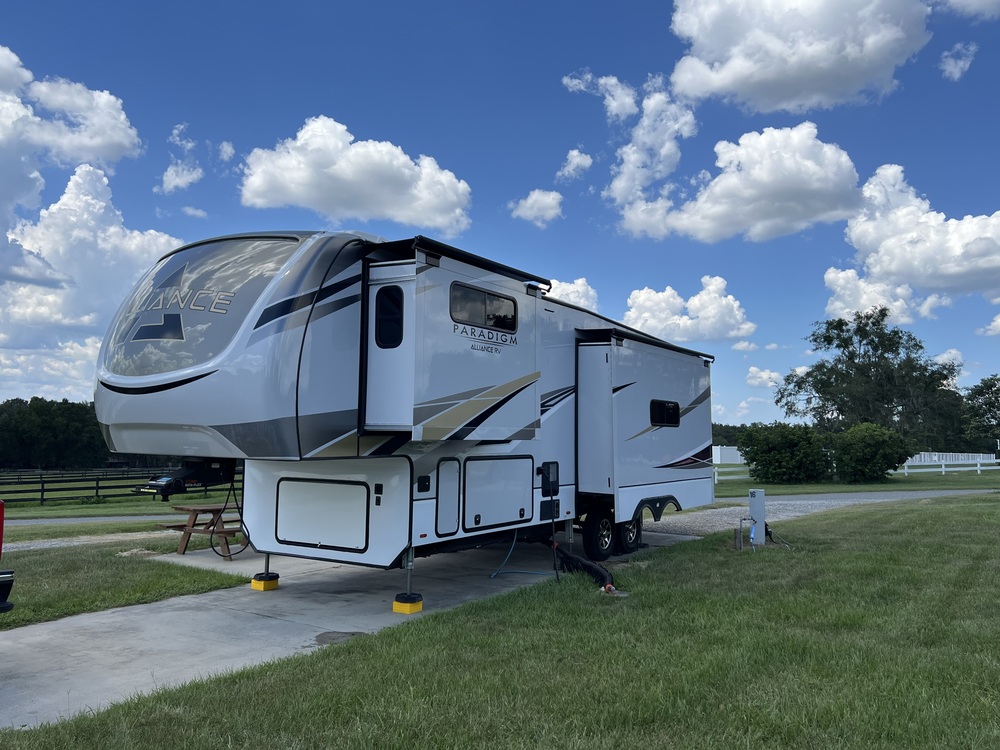 Our Alliance Paradigm 310RL has given us all the comforts of home while we were on the road. The kitchen features stainless steel appliances, solid surface countertops, a large pantry, and ample storage space. The living area is perfect for relaxing or entertaining guests, with a sofa which becomes a pull out bed, reclining theater seating, and a fireplace that doubles as an bonus electric heater. The bedroom offers a comfortable RV king bed with new mattress, a wardrobe closet, and a smart TV. The bathroom includes a spacious shower, a porcelain toilet, and a vanity with a sink. It comes with 3 great Air Conditioners., 98 gallon freshwater tank, 100+ gallon Gray tanks, and 50+ gallon black tank and 12 gallon water heater. It sleeps 4. Power leveling!