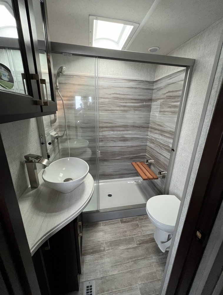The Palomino River Ranch 392MB is equipped with all the features you need for a comfortable camping experience. The kitchen is complete with a full size refrigerator, stove, oven, and microwave, allowing you to prepare home-cooked meals while on the go. The bathroom includes a very spacious shower, sink, and toilet for added convenience.
