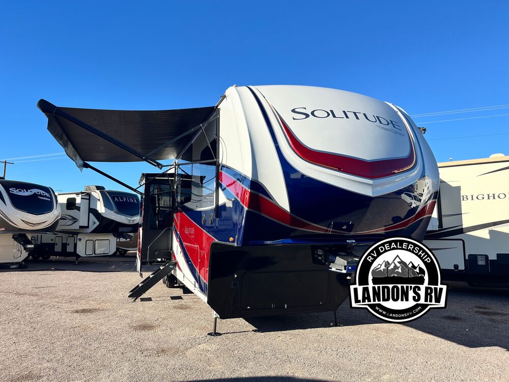 RARE FULL BODY PAINT ALERT + INDEPENDENT SUSPENSION! We sell a ton of Solitude fifth wheels and having full body paint ones is always special to have. That coupled with one of the most popular floor plans. This rear kitchen with the abundant outside storage is great. They do a great job as well with the bathroom and the double vanity sink and large shower.