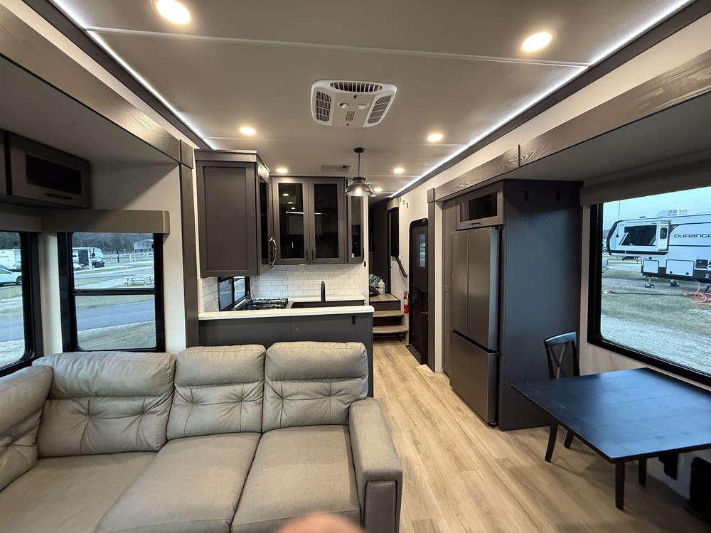 Exterior Highlights: Triple axles for smooth towing, auto-leveling system, massive pass-through storage, and a rear garage that's perfect for toys like bikes, kayaks, or ATVs (14-foot garage space!).