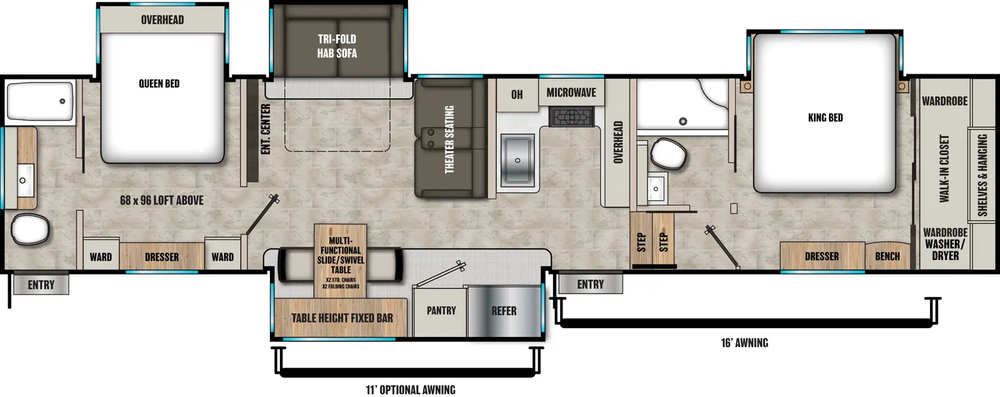 Linen Decor, two full bedroom unit with two full bathrooms! Front bedroom with king size bed and slide out, bathroom off of bedroom with rectangle shower with foldable seat/skylight/sliding glass doors, full front wardrobe closet with storage and washer/dryer hookup, dresser and bench across from king bed, 2nd rear bedroom has queen bed with slide out, his/her wardrobe cabinets and dresser separating them, loft above rear bedroom, walk thru the rear bedroom to get to the 2nd full bathroom which has tub/shower combo with skylight, middle living area and kitchen with opposing slide outs, theater seating across from the LED TV and fireplace, tri-fold/hide-a-bed sofa, table height fixed bar with muti functional slide/swivel table that comes out, 2 standard table chairs and 2 folding chairs, pantry closet, 16 cu. ft. Side-By-Side Stainless Glass 12V Fridge W/ Smart Touch Functions, 30" Stainless Residential Size Microwave, 24" 4 Burner Range/Oven W/ HD Grates & Drawer, 3-13.5btu fully ducted A/C units, 60,000btu on demand water heater, 2 power awnings, 6-Point Electric Auto-Leveling System W/ Digital Bluetooth Keypad, WEATHER SHIELD + 0° Cold Tested & 110° Hot Tested (Extreme Temperature Chamber), Radiant Pro Weather Barrier System (Roof, Cap, Underbelly, Slides, & Pass-Through), Sectionalized Underbelly & Heated Gate Valves W/ Radiant Pro + Circulating Furnace Forced Heat, upgraded 40,000btu fully ducted furnace, 200W Roof-Mounted Solar Panel W/ Scaleable Add-On Panel Capabilities, 9' wide (110"), 4 slide outs, sleeps 6