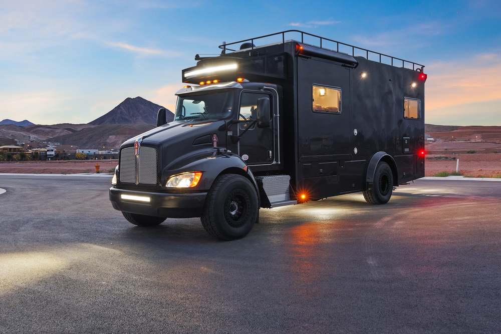 The Beast! A One of a kind All Terrain Off Grid RV capable of roaming the Earth, on 42" tires. , for Overlanders, Racers and Custom RV Enthusiast!! This is a custom designed off grid Luxury RV similar to Global Expedition Vehicles, (Of course this is not built by Global Expedition Vehicles) on a Kenworth chassis.