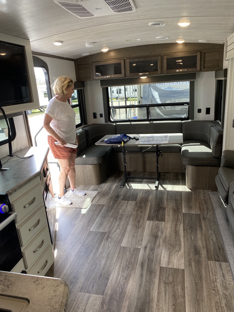 We think that for a couple, this is the best floor plan for a 30 foot camper. King size bed, large shower, and a big open floor plan for the living/kitchen area.