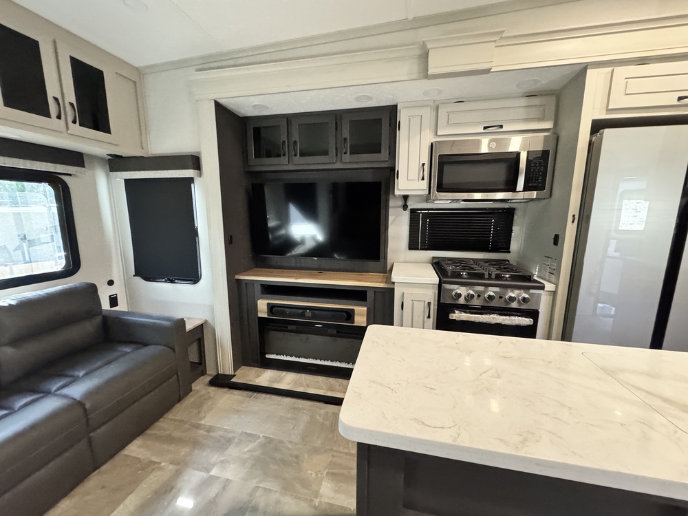 The 398MBL is equipped with all the amenities you would expect in a high-end fifth wheel, including a spacious living area, fully equipped kitchen, and a comfortable sleeping area. The interior is beautifully decorated with high-quality materials and finishes, giving it a sophisticated and elegant look.