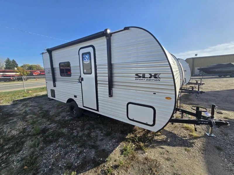 Sport Edition branding on the Jay Flight SLX 170FQ means the Customer Value Package Sport Edition is mandatory from the factory. That bundle layers in the key campsite features buyers expect: power awning with LED lights, marine-grade exterior speakers, backup camera prep, detachable power cord, spare tire with cover, stabilizer jacks, entry door with window and shade prep, large folding grab handle, and G20 dark-tinted privacy windo
