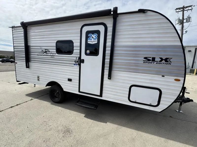 Jayco Jay Flight SLX 170BH Sport Edition, VIN 1UJBC0AJ1T1Y50550, is a 2026 single-axle bunkhouse designed to be easy to tow and straightforward to own. The factory label shows an unloaded vehicle weight of about 3,075 lbs on a 3,750 lb GVWR chassis, with an overall length just over 21 feet, so a properly equipped midsize SUV or half-ton truck can handle it comfortably. You still get real tank capacity for weekends away: 30 gallons fresh water and roughly 20 gallons each for gray and black, plus a 20 lb propane bottle and a 10' power awning for quick setup at the campsite.