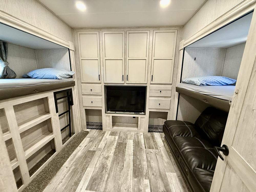 One of our favorite features is the incredibly spacious bunk room. With opposing slides, its one of the largest bunkhouse layouts on the market and has been perfect for creating a comfortable, separate space. The five slide-outs make the entire RV feel open and residential, giving everyone room to relax and feel at home.