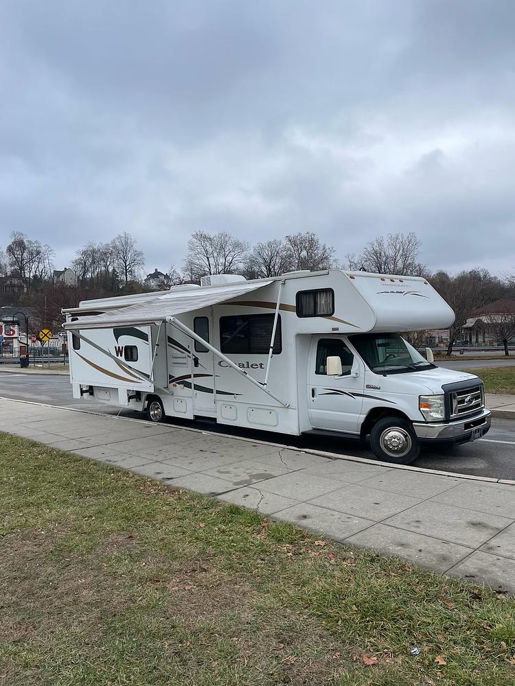 2 slide-outs, manual awning, roof AC, rear ladder, trailer hitch.