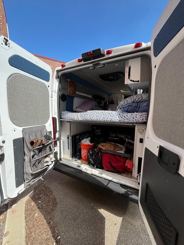 The walls and ceiling are sound barriered, insulated with lamb wool and finished with ¼ panel and fabric using a L track system. The van is insulated, except the side door and front cab.