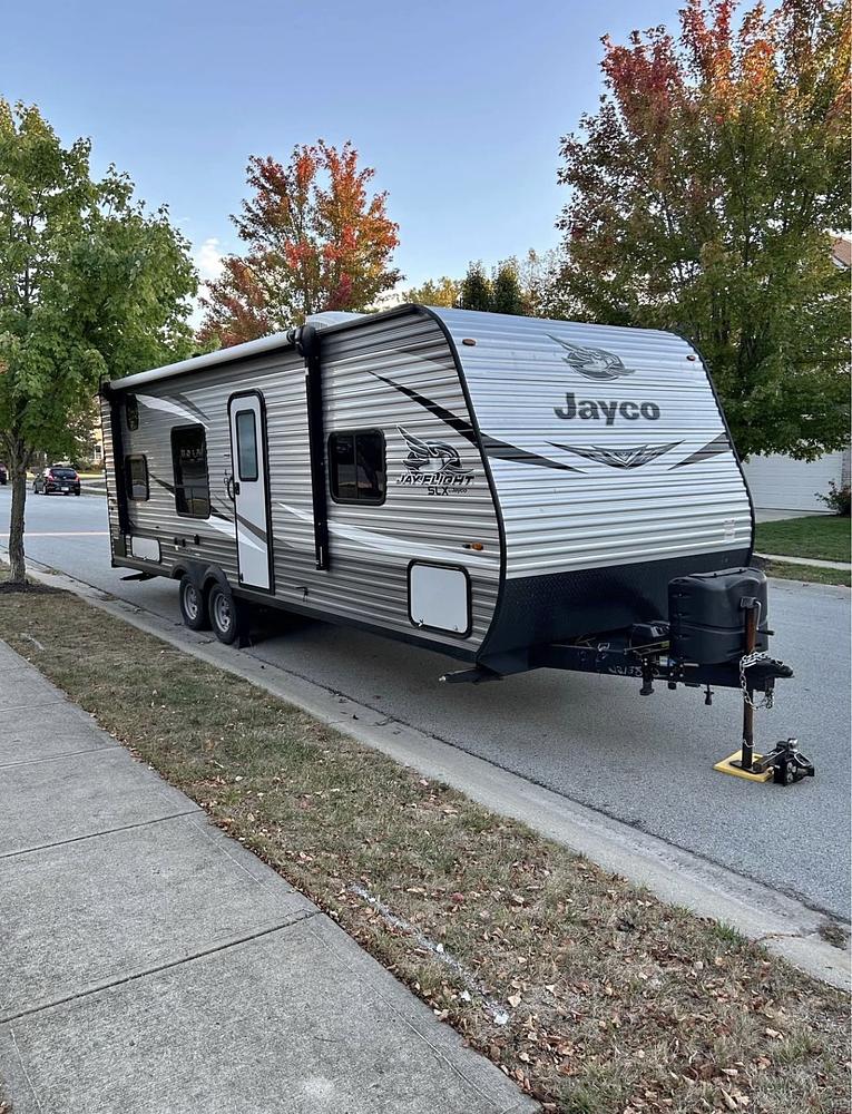 Beautiful and clean 2021 Jayco Jay flight 264BH. Outdoor features include: shower with lock and key, auto awning with radio speaker, 3 doors to storage spaces, and cable hookup & mount for tv.