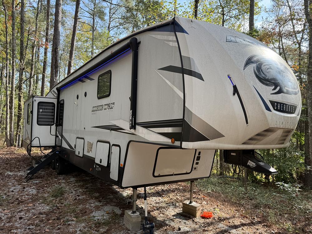 The Forest River Cherokee Arctic Wolf 3660 Suite is a luxurious fifth-wheel trailer designed for those who enjoy the finer things in life while on the road. With only 500 miles on the road, this 2021 model is practically brand new and ready for all your adventures. It's got upgraded hardwood counter tops, upgraded mini split HVAC, reverse osmosis filtration system with countertop tap, addition electric water heater added next to the gas water heater and an upgraded keypad smart lock.