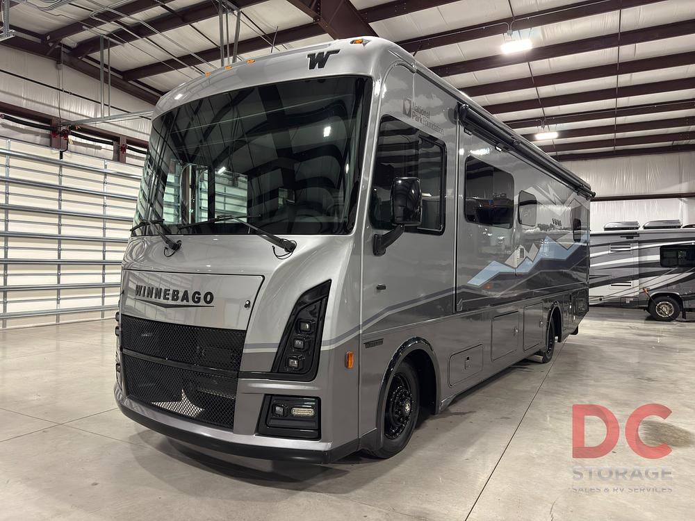 Whether you’re chasing horizons or staying put at your favorite campsite, the 2023 Vista 29NP Glacier Edition is ready to elevate your journey. Front living area features a dinette booth and sleeper sofa with TV mounted above the dinette booth. Front leather captain chairs swivel in to face the living space. Bunk over cab drops down for additional sleeping space. Galley is equipped with a double stainless steel sink, (3) burner LP range, oven, microwave, and (2) way refrigerator. Mid coach bathroom with a fiberglass shower with skylight and glass door, vanity with sink, corner mirrored medicine cabinet & foot flush toilet. Rear bedroom includes a walk around king size bed with dual wardrobes and overhead cabinets, plus extra large wardrobe/dresser area and LED TV across from the bed.
