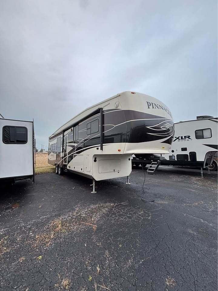 Very nice full-body paint 2013 Jayco pinnacle 36REQS. The unit is in very nice shape for its age. This unit has everything you need for your adventures, including 4 slides, 2 reclining couches, a table and chair set, 2 TVs, a double door gas/electric refrigerator, all slides have slide toppers, lots of storage, big pass-through storage, an electric awning, electric leveling, a fireplace, and so much more