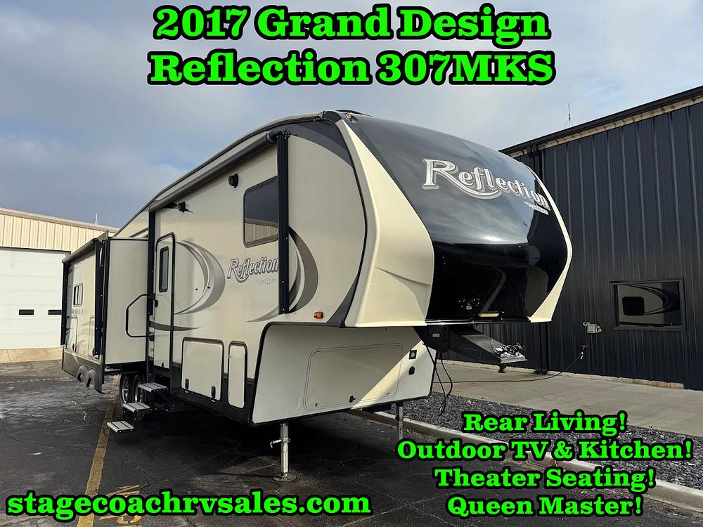If you have been searching for a fifth wheel with triple slide outs, a rear desk, a kitchen island, and an outside kitchen and TV then take a look at this Grand Design Reflection mid-sized fifth wheel 307MKS.