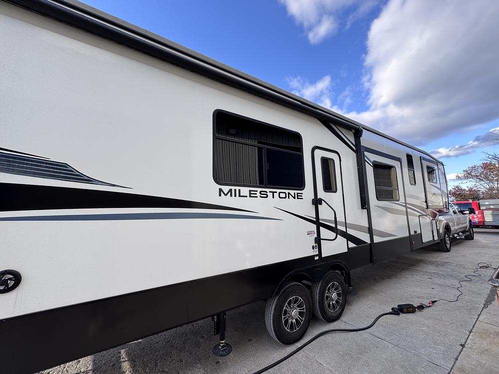 The 2021 HEARTLAND MILESTONE 370FLMB is a luxurious Fifth Wheel trailer designed for a comfortable and enjoyable camping experience. This practically brand-new model is in pristine condition and ready for all of your travel adventures. The MILESTONE 370FLMB boasts a spacious interior layout with plenty of room for relaxation and entertainment. The front Living Room with electric fireplace and rear king size bed, a mid bunk and full bathroom make this model a versatile fifth wheel for all kinds of traveling. The stylish trim level adds a touch of sophistication to this already impressive model and can sleep up to 10 people.