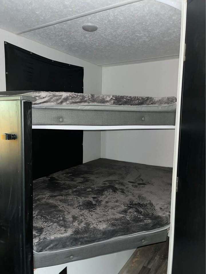 2022 Freedom Express. Coachman Ultralight package weighing in GVWR at 7,600 lbs is among the easier to tow. Check your truck specifications to see how convenient this could be. There are two side doors, one to the master bedroom and the other to the main living area. Turning on the lights at entry shows a display of blue mood lighting, perfect for soothing evenings camping. A bunkhouse has two full-size beds and USB charger plugs beside each bed. The bottom bunk lifts for a storage area. Will include dish satellite, and a portable generator, that we purchased separate There is an outdoor kitchen with a sink, fridge, and grill.