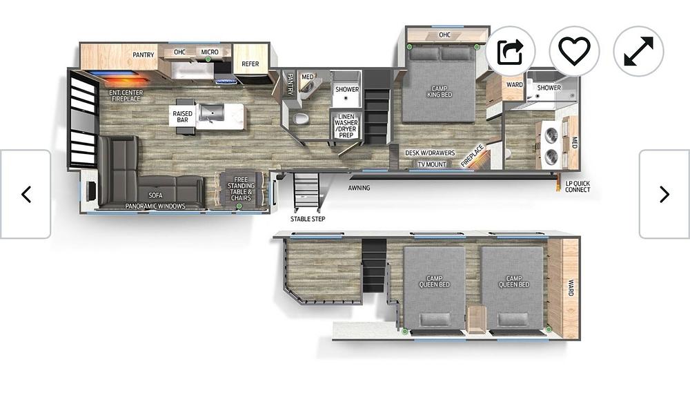 2025 campsite reserve 39jd. Showroom new, never been used or slept in. Spacious living area and kitchen. Big screen tv with hidden pantry behind it. Sleeper sofa bed, master bedroom with king size bed and on suite master bath with double vanity and full shower. 2nd full bathroom in hallway. Loft area with 2 queen beds and additional storage space on opposite side of loft. Under the stair storage bins along with ample storage in kitchen area, double door refrigerator (full size), 3 burner stove and microwave. Washer and dryer hook up. Sleeps 8 people. 3 slides with outside speakers and tv hook up along with outdoor shower hook up.