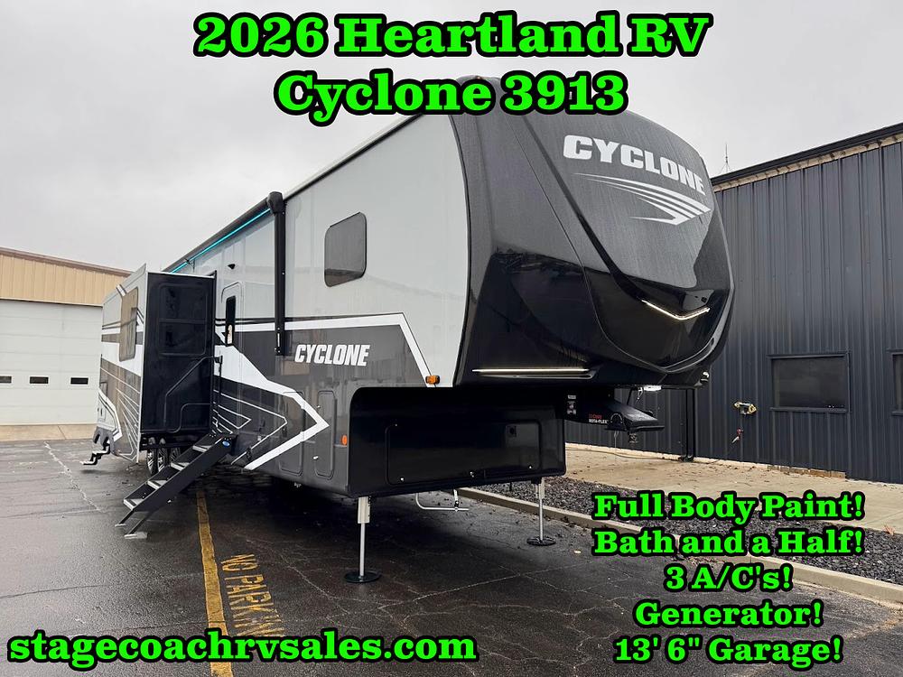Satisfy your wanderlust with a Heartland Cyclone fifth wheel toy hauler! You won't have to sacrifice any luxury either, with indulgent features like the ducted, fully enclosed, and heated underbelly provides added protection and warmth. Inside, the LED interior lighting throughout ensures that every corner of your RV is bright and inviting, and the bathroom skylight brings in natural light and fresh air, creating a welcoming and refreshing space. Plus, the central command center with built-in tank monitoring keeps you informed and in control, making it easy to manage your resources. Also, the Premium Exterior Package includes diverse features such as Dexter axles with ABS and tow assist with sway mitigation, and the Keyed-Alike lock system ensures that all your locks are keyed the same, providing added security and convenience. Come find the perfect model for you today!
