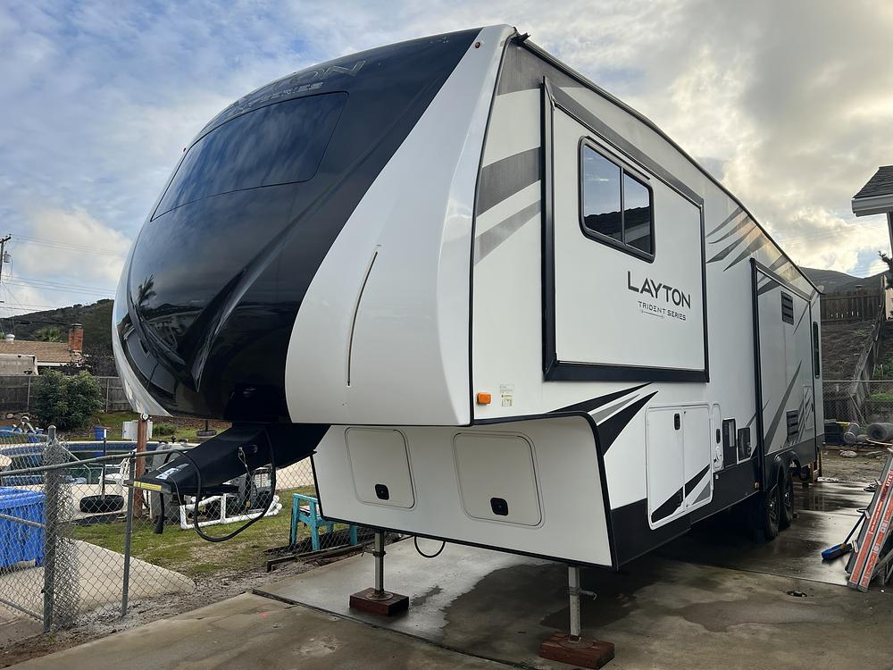 This is a 2016 Layton Trident 359RL 5th Wheel. The length of this trailer is 35' and has just about everything you would expect in a travel trailer. This trailer has served as a space for my dad to live in on our RV pad while we built him an ADU. We purchase this in August of 2024 and he lived in it full time for 12 months. We have both extremely cold temperatures in the winter down in the 20's and extremely hot summers up to 115 degrees. In the winter we used space heaters as the floor heater does us a lot of propane and we had the 50A power available. In the summer with two roof AC units he was able to maintain comfortable cool atmosphere.