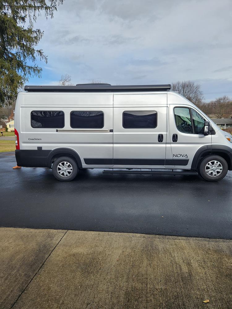COACHMEN NOVA 20D on Dodge Promaster chassis which has traffic sign recognition, forward collision warning plus pedestrian/cyclist emergency braking, electronic stability control, cross wind assist, all speed traction control, park view rear back-up camera, tire pressure monitoring display, push button start, LED headlights and fog lamps, automatic headlamps, adaptive cruise control, rain sensitive windshield wipers, automatic high beam control, navigation with 10.1" touchscreen, leather wrap steering wheel, active driving assist system, surround view camera system. The Nova 20D comes with two rear twin beds that can be made into king size bed, lagun adjustable table, Truma Combi Plus furnace/water heater runs on power or propane, Truma Aventa 13.5 110V A/C, 12V 24" smart TV, 12V refrigerator with separate controlled freezer, induction cooktop, microwave/convection oven, fantastic fan with rain sensor, two 110W solar panels w/dual charging, 2.8KW gasoline generator, and power armless awning w/motion sensor. Rover rear ladder w/matching spare tire and rim.