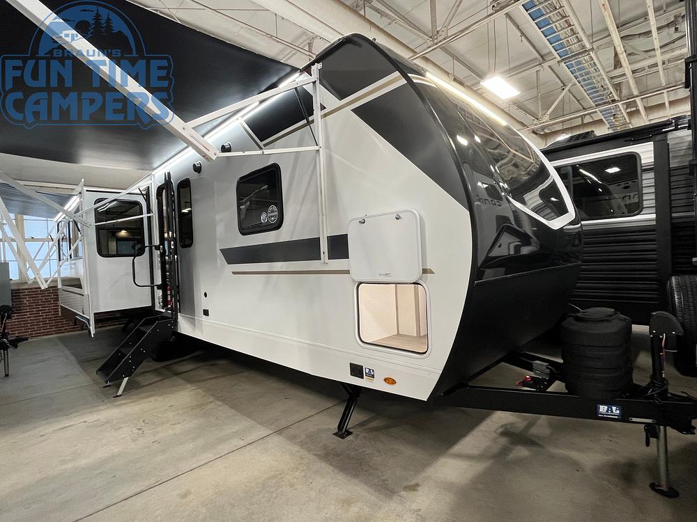 SLEEPS 6, 15K BTU A/C, 13.5K BTU 2ND A/C, 3 BURNER STOVE W/OVEN, MICROWAVE, 10 CU FT ELECTRIC FRIDGE, FIREPLACE, TV, THEATER SEATING W/HEAT & MASSAGE, USB PORTS, KING SIZE BED, WASHER/DRYER PREP, WALK IN CLOSET, WIFI PREP, 2-POWER AWNINGS, ELECTRIC TONGUE JACK, ELECTRIC STABILIZER JACKS, PASS THRU STORAGE, SPARE TIRE, BACK UP CAMERA PREP, 42K BTU TANKLESS WATER HEATER, ROOF LADDER, SOLAR PREP, EXTERIOR SPEAKERS