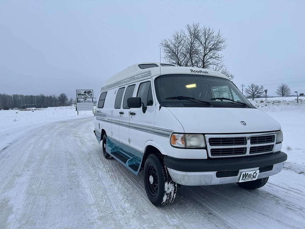 This is a 1996 roadtrek versatile, on a Dodge Ram 3500 chassis. It has the 5.2 L motor with 73,418 miles. There is an onboard Onan generator , with 131 hours. Rear dinette converts to Bed area, dimensions are 50”x 72“ second row seating also turns into single/recliner style beds. This would be considered a weekender style camper, cause it does not have an onboard water heater. There is on-demand water heat, at kitchen sink. There is no shower. It does have fresh, gray, and black water holding tanks. furnace microwave and AC all work as they should. Tires are good. This is a nice inexpensive unit, with nice miles, to do traveling.