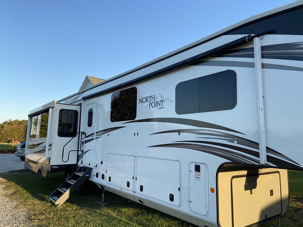 Jayco North Point 377RBLH luxury 5th wheel. King master suite with upgraded memory foam mattress ,residential style side by side fridge, theater reclining seats, large couch that makes into queen bed ,dual ACs, bunk room, trifold couch/bed with single bunk above ,loft sleeping area for 2. Sleeps 8/9, extra outside small fridge with built in grill, 4 TVs, electric fireplace, 4 slides ,2 awnings, basement storage, 43 ft bumper to king pin, 14k lbs empty/16.7k lbs gross, garage kept. Excellent condition. Non- smoking. Title in hand. We have owned the camper since 9/2020. The first owner only kept it a few months .