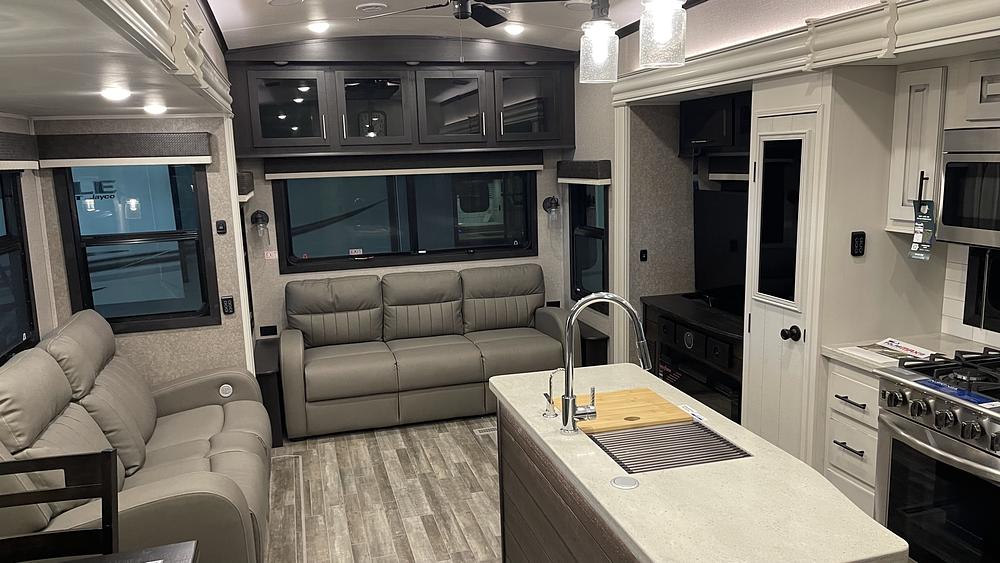 Stepping inside, you are greeted by a modern and elegant interior that is both functional and inviting. The living area features a large sofa and theater seating, perfect for relaxing after a long day of exploring. The kitchen is equipped with top-of-the-line appliances and ample storage space, making meal prep a breeze.