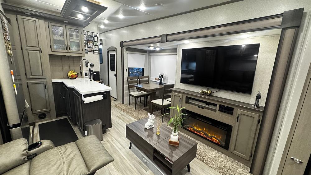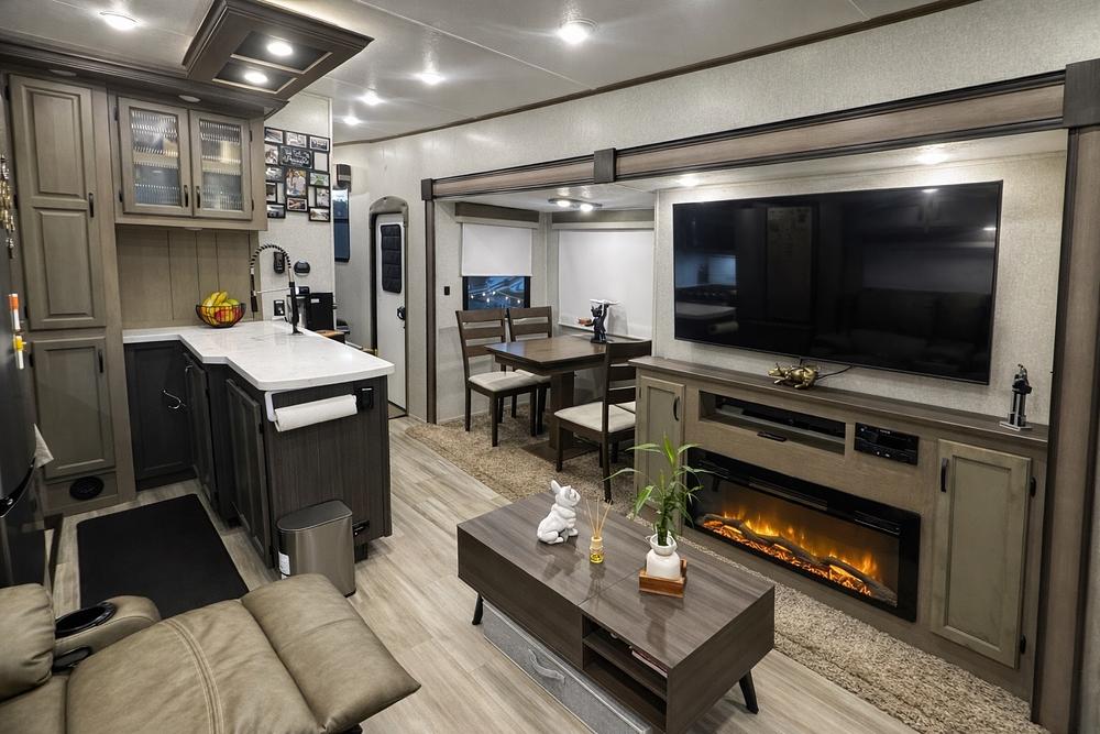 Inside, you'll find all the amenities you need for a comfortable stay on the road. The kitchen is equipped with top-of-the-line appliances, ample storage space, and a large sink for easy meal prep and cleanup. The living area features plush seating, a flat-screen TV, and a cozy fireplace for chilly evenings. The bedroom offers a comfortable bed and plenty of storage for all your belongings.