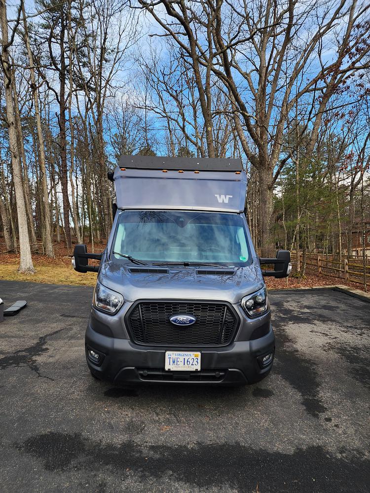 Built on a Ford Transit AWD chassis for enhanced capability, with features like all-terrain tires, added ground clearance, power running boards, and a 5,000 lb tow hitch.