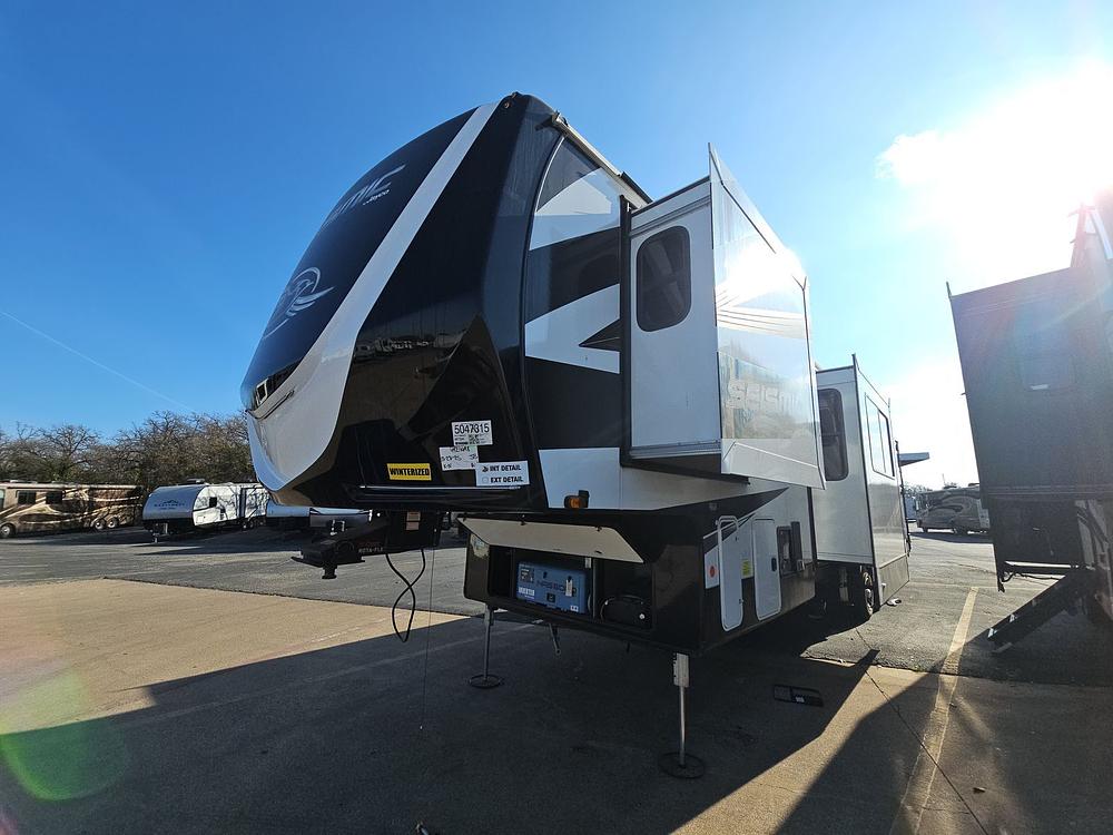 The Seismic 399 features a versatile garage area that can transport your favorite toys safely and securely, whether it’s ATVs, motorcycles, or other outdoor equipment. Its well-planned layout includes ample storage, a full kitchen, and a cozy living area for relaxation after a day of adventure. Step outside to enjoy the outdoors with an accessible patio or awning area, perfect for entertaining or enjoying nature.