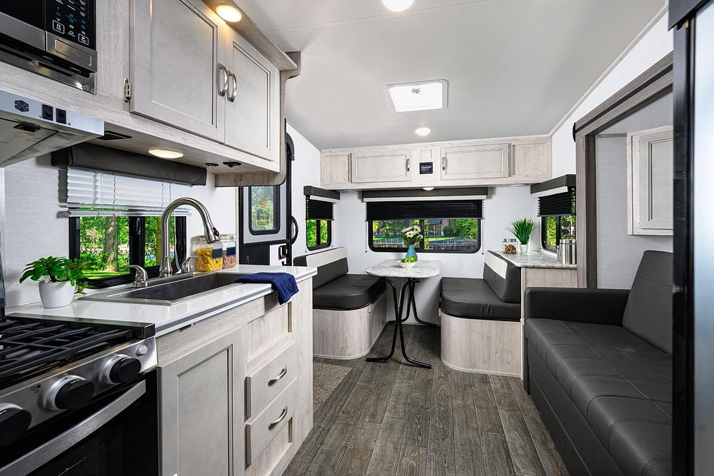 What sets the 23TWS apart is its twin-bed sleeping layout that easily converts into a king, offering unmatched versatility for couples who want personal space or a large sleeping surface when needed. The open living and dining area provides room to relax or entertain, while the well-appointed kitchen and full bathroom make this model suitable for weekend trips or longer stays. Smart storage throughout keeps everything organized and within reach.