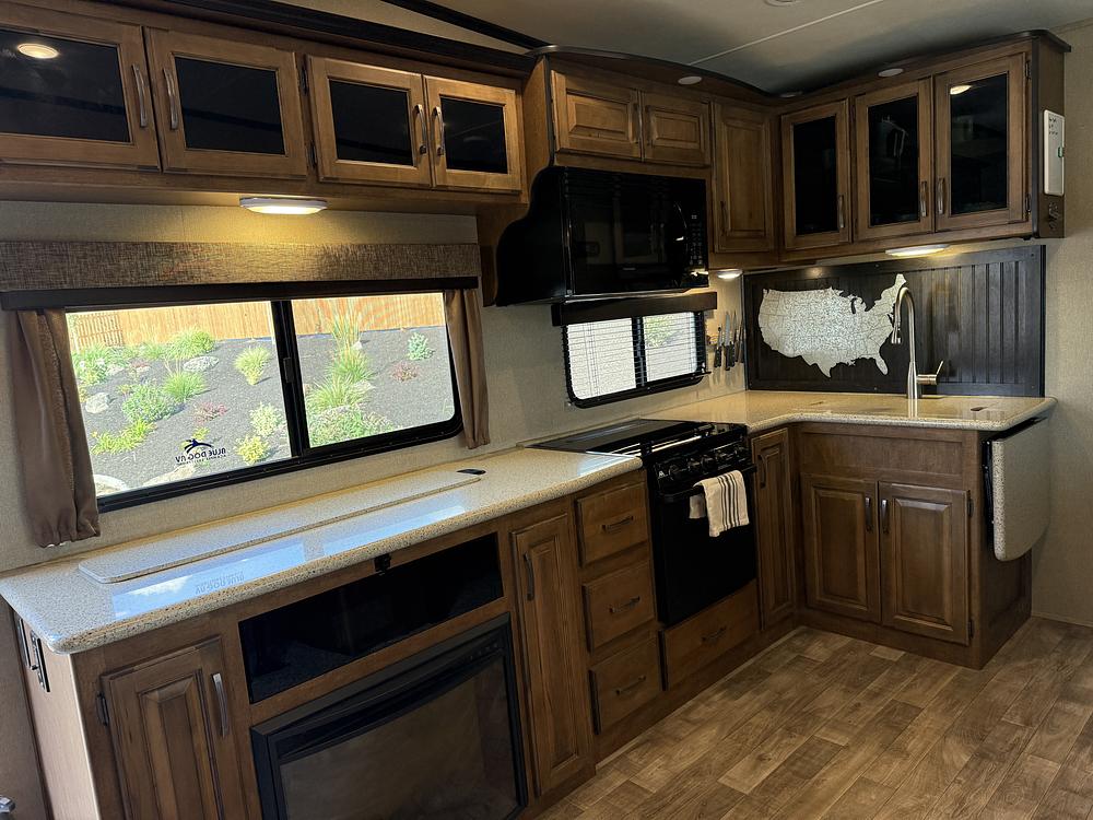 34' length, auto level, (2) slides, outdoor kitchen (with TV and refrigerator), interior electric fireplace, XL double refrigerator, bunkhouse with wardrobe, electric awning, massive storage options, 4 seasons package. 74 gallon fresh, 86 gallon gray, 43 gallon black, queen main bed, couch and dinette have bed option. This RV has been very well maintained and is in excellent condition. It's very clean. Exterior photos will be added soon.