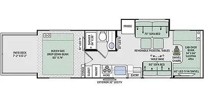 Auxiliary gas tank, tiedowns, storage cabinets, Queen-size drop-down bed, Patio/deck, Flat screen TV