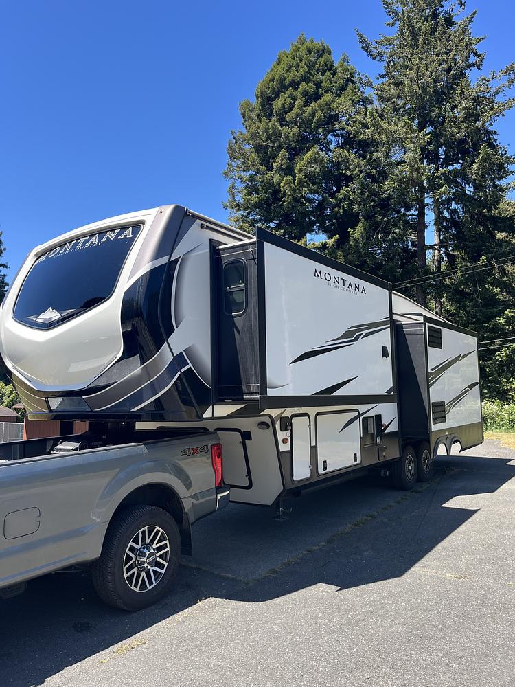 This 2021 Montana High Country is in good condition and ready to go. It is a non smoking rig with newer Salian tires and recently done wheel bearings. Has a two inch towing hitch on the rear. Two air conditioners, LP/electric refrigerator, hide-a-bed sofa, electric reclining theater chairs, LCD TV with fireplace heater below. COMBO washer/dryer prep, king size bed. Used for travel use not full time.