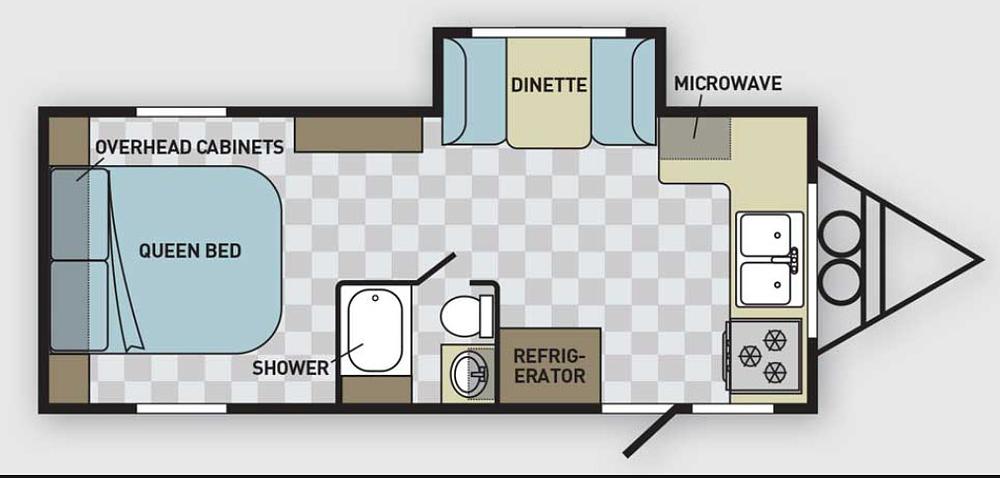 Excellent layout with front kitchen, open living space, and a separate bedroom with walk all the way around queen-sized bed