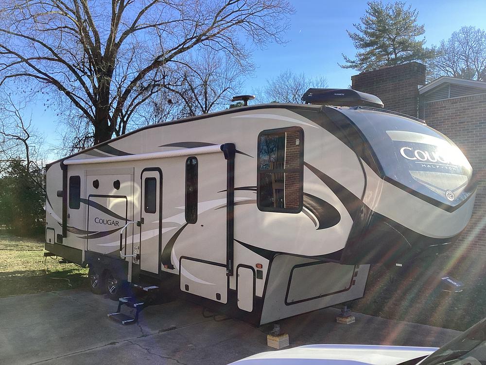 This camper has an outside kitchen with a black stone grill and refrigerator. It has theater seating with a fireplace, a couch to bed, a big screen TV to enjoy, as well as a TV in the bedroom. You will stay comfortable with 2 ACs. This Cougar is in good condition with no leaks.